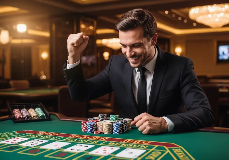 Excited casino guest winning a baccarat game at Casino Filipino Malate, holding chips and smiling confidently.